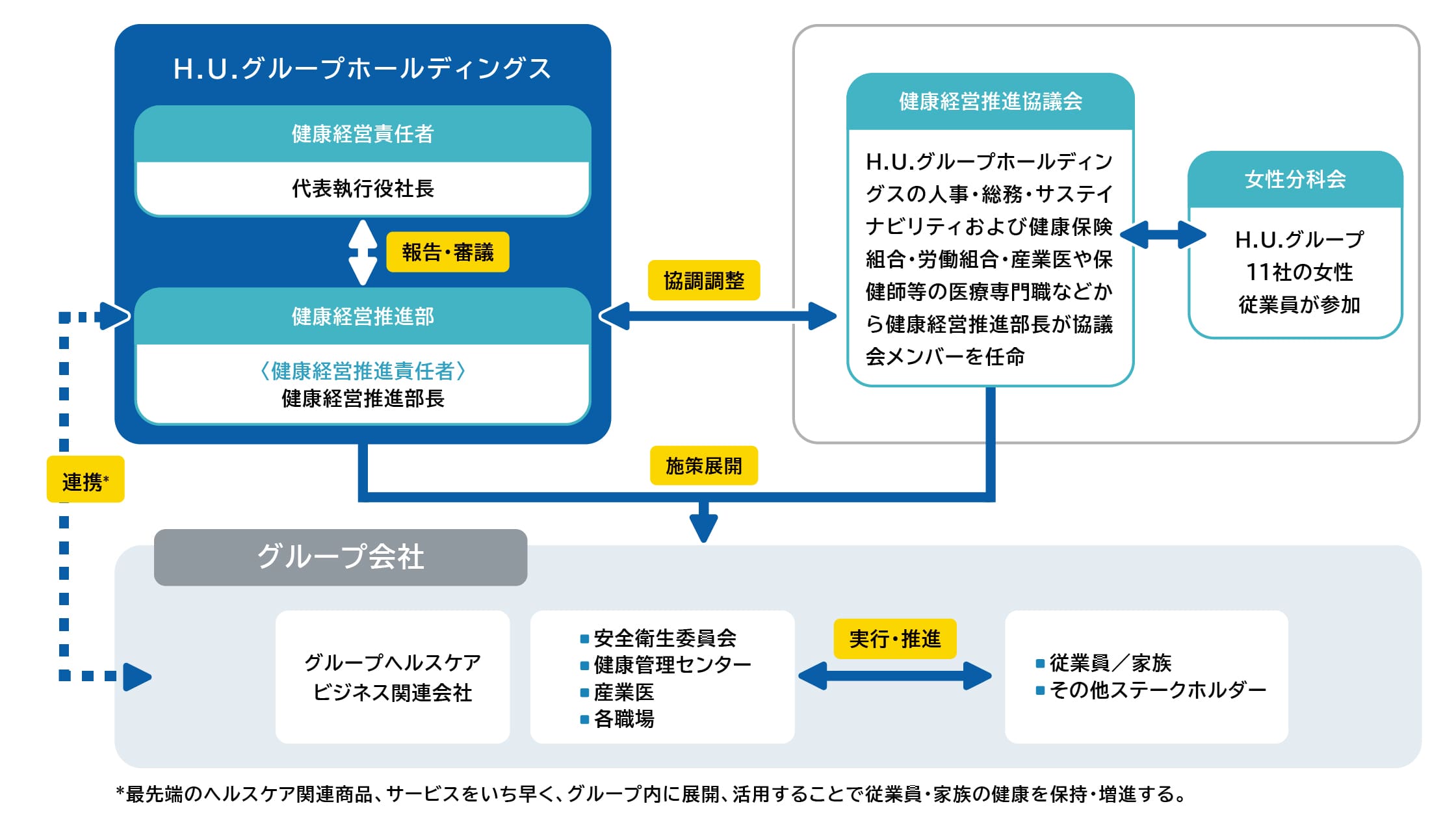 H.U.グループホールディングスの人事総務本部長を責任者として、同部署が主体となる人的資本部会において、各々の方針に紐づく活動を推進しています。人的資本部会に加え、安全衛生委員会や健康経営推進体制を整備し、活動計画や成果については定期的に進捗を把握し、今後の対応や是正活動に努めていきます。